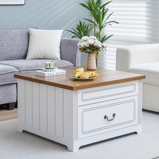 White UV-painted finish base with brown textured wood grain tabletop combines modern farmhouse and rustic styles, featuring classic barn door panels that complement any home decor. Both tabletop sections lift to 90° via high-quality hinges, revealing large hidden compartments for storing blankets, pillows, magazines, and living room essentials. Specification: Product Dimensions: 31.5" L x 30.51" W x 17.6" H Product Weight: 43.65 lbs Main Material: MDF Color: White+Brown Finish: UV painting Assemble required: 60 mins Product load-bearing: 200 pounds Assemble required: Yes. And there are all parts, hardware, screw bag, and paper instructions in the package.