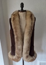 Big fluffy tuscan lamb collar on a suede jacket, shearling lined. Button closure. 2 outer pockets that are small and shallow. Basic wear to suede, pulling etc. - All my furs are pre-owned. I inspect them closely and describe to the very best of my ability.