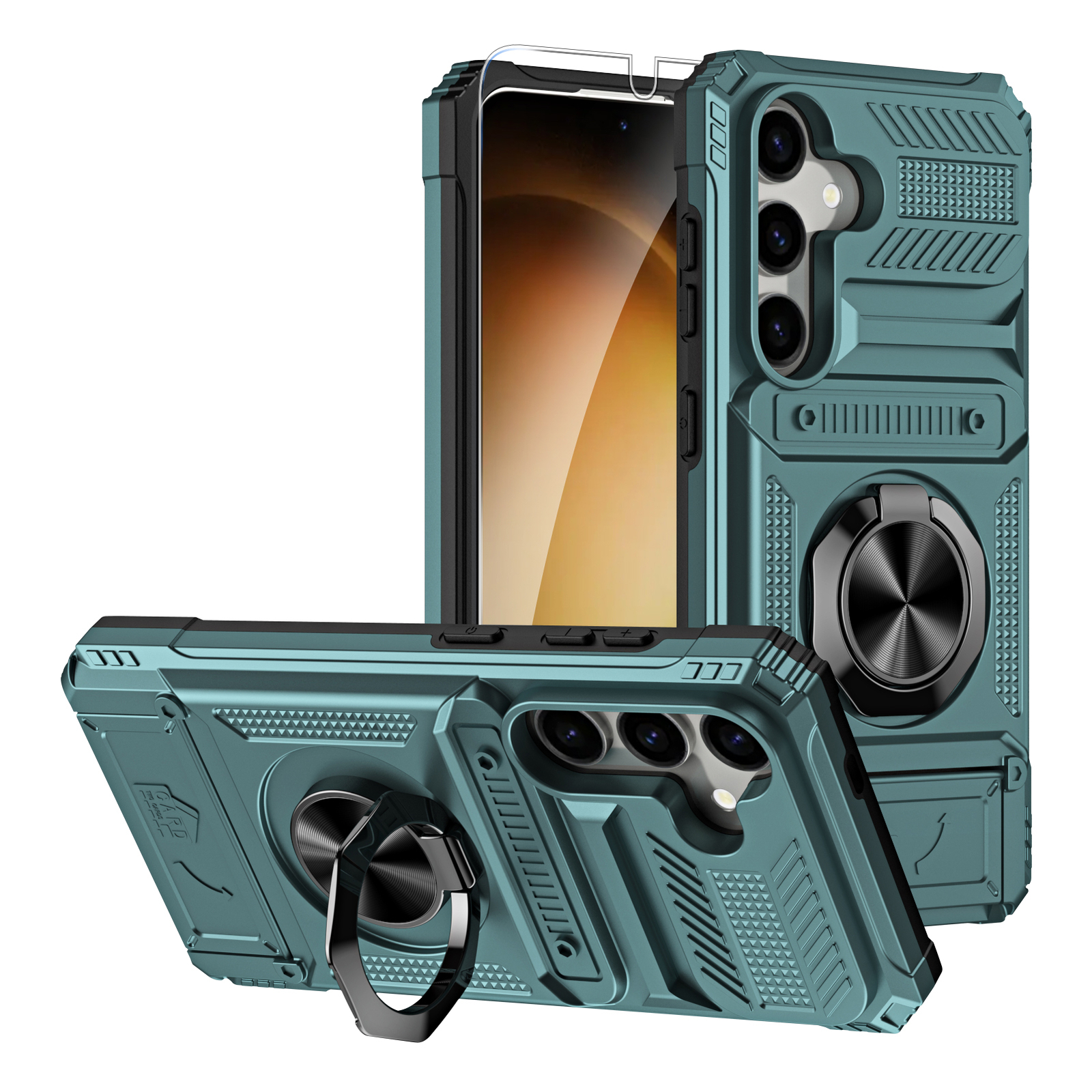 【Heavy Duty Protection】 A dual-layer rugged case with a TPU+PC outer cover and a hard PC front bumper provides military-grade shock-absorbing and anti-drop protection. 【 Card Holder Wallet Case】 The hidden card slot design can securely store at least 2 cards, you can easily store your driver's license, credit cards, or some cash without the need to carry a bulky wallet out, It's very practical and convenient. 【Built-in Bracket】 This case comes with a built-in bracket that provides a stable support for your Phone, allowing you to watch videos, movies, and even participate in video conferences with ease. 【Precise Cutouts】 Perfectly aligned cutouts allow easy access to the speaker, camera, buttons and other features. Package: 1 X Case or Case with Tempered Glass Screen Protector.