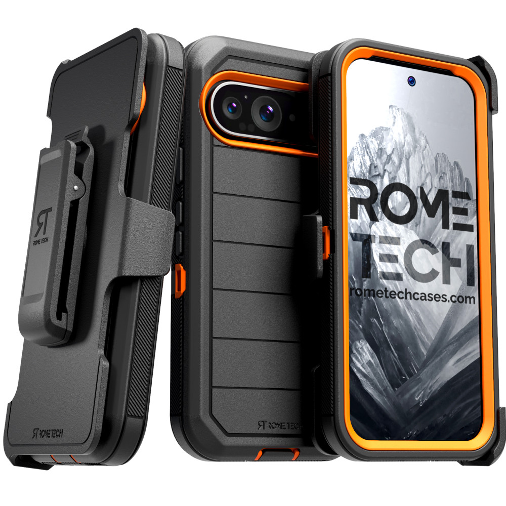 Protective Cases for Pixel 9 Series feature four layers of 360-degree heavy-duty shockproof protection. The defender case is made with a hard polycarbonate inner shell and a soft outer rubber layer.