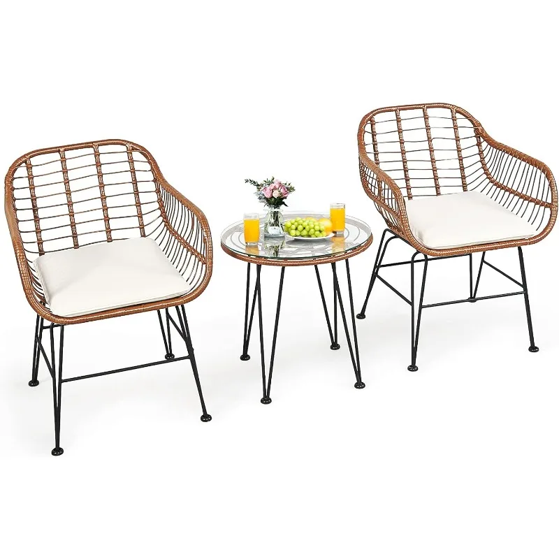 3 Pieces Patio Furniture Sets Outdoor PE Furniture with Cushion and Glass Table